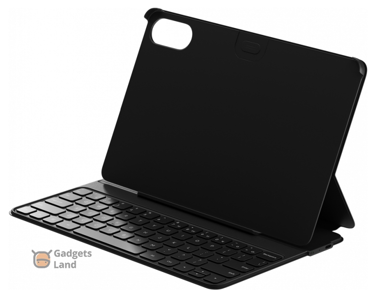 Минималистичный чехол черного цвета со встроенной клавиатурой, которая позволяет превратить планшет в ноутбук. Для углов корпуса предусмотрена дополнительная защита, есть вырез под модуль камер. Сбоку расположен зарядный разъем USB Type-C. В разложенном виде чехол формирует удобный для работы угол наклона. За счет прочного устойчивого каркаса модель крепко держится на горизонтальной поверхности.